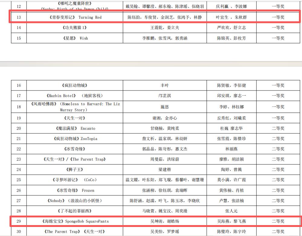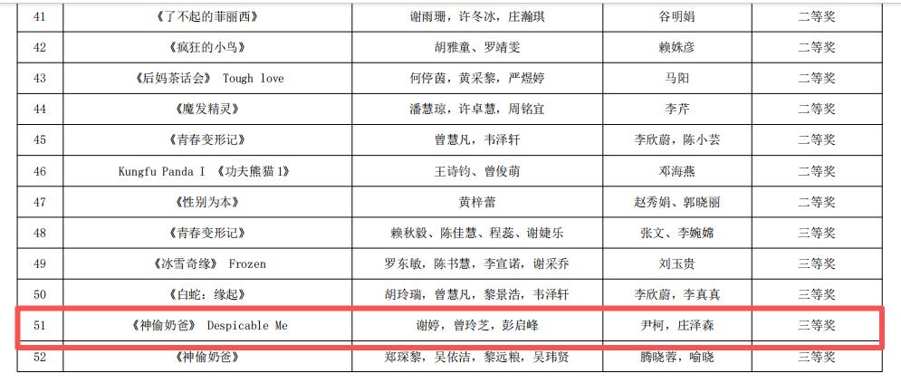 经过激烈角逐,由叶宜生、朱秋群老师指导,陈钰韵、车俊贤、金润芝、张鸿予、林静五位同学配音的作品《青春变形记》(Turning Red)凭借地道的口语模仿、精准的情感把握和流畅的叙事表达,荣获大赛一等奖。由吴海燕、黎飞燕老师指导,吴坤洧、谢皓炀同学配音的《海绵宝宝》(SpongeBob SquarePants)片段,以生动的角色演绎和出色的音画配合,荣获二等奖。由尹柯、庄泽森副院长指导,谢婷、曾玲芝、彭启峰同学配音的《神偷奶爸》(Despicable Me)片段,以其清晰的语音和富有张力的表现,荣获三等奖。