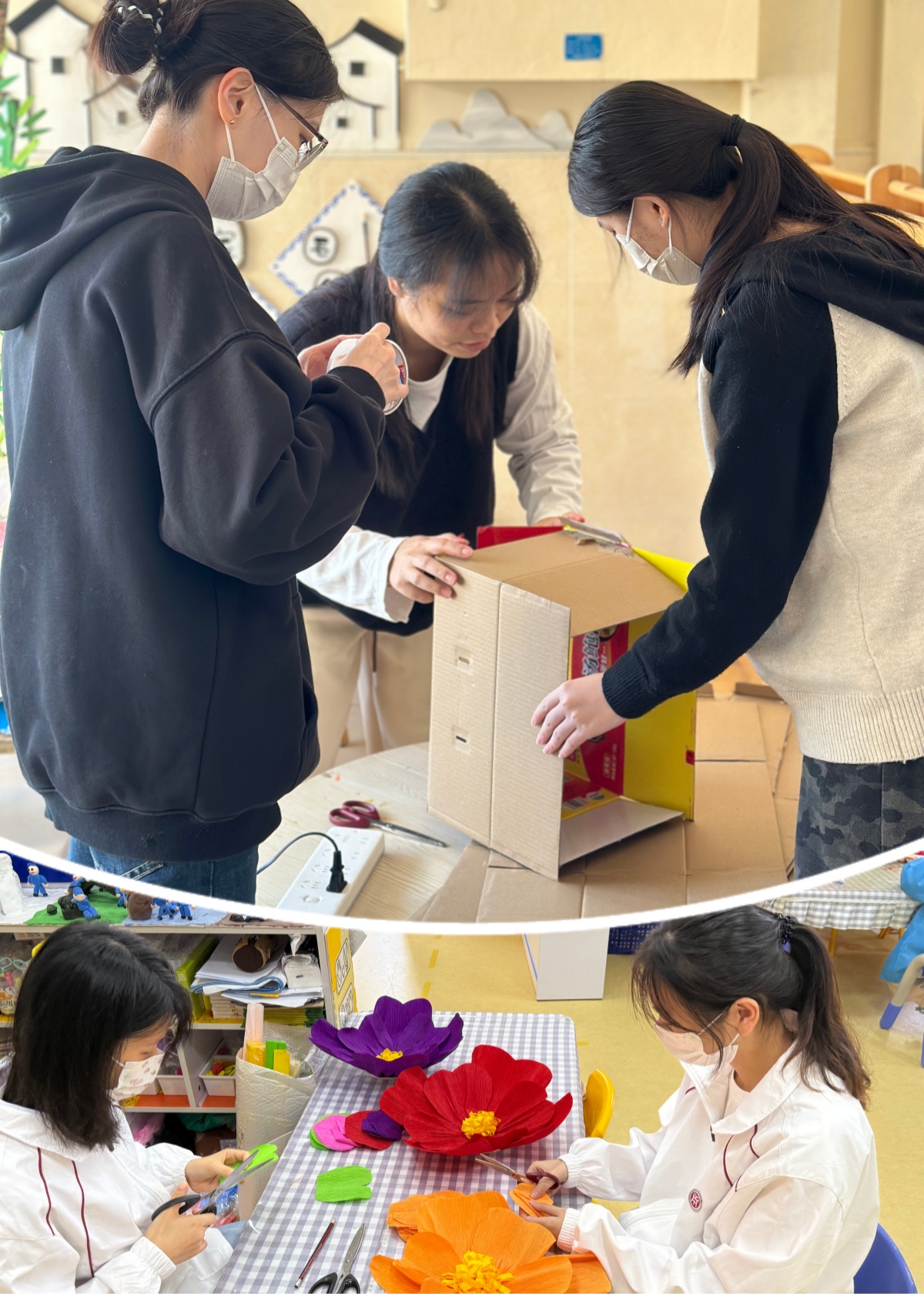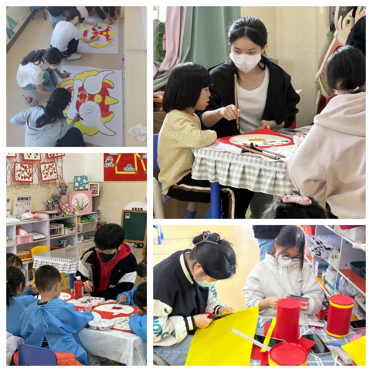 为了这场充满意义的成果展,学生们入园第二周就开启了紧锣密鼓的筹备工作。他们结合幼儿园各年龄段幼儿的认知特点与兴趣偏好,配合园方确定的绘画展主题与创作形式——大班以国画元素为主,中班采用水粉画元素,所有作品均融入新年元素进行创作;实践中,他们化身 “创意导师”,带领小朋友们观察生活、捕捉灵感,从彩纸剪裁、黏土塑形到水彩绘画、手指拓印,每一个步骤都耐心指导,每一份作品都倾注心血。