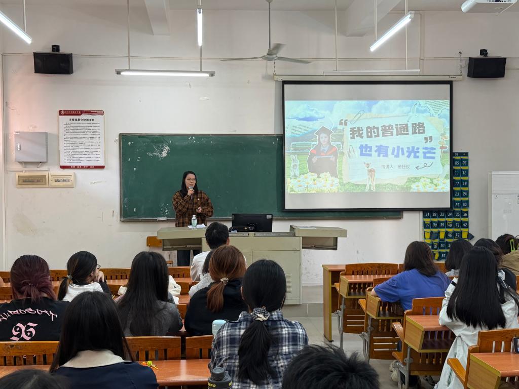 分享会上,杨钰仪以“自我画像、成长足迹、成长感悟、职业规划”为脉络,深情回望了自己在华商的成长蜕变。从华技时期“从躺平到支棱”的觉醒,到华职阶段“从迷茫到突破”的自信重建,从专插本路上的遗憾与收获,再到职场实习中“在压力中蜕变”的成长,她毫无保留地分享了自己在求学、实践、求职过程中的困惑与坚持、挫折与收获。特别提到在党组织的培养与老师的指引下,她突破“中专基础差”的自我设限,主动参与各类实践活动,最终成长为一名坚定的共产党员和综合素养全面的优秀学子,让在场学子深刻感受到党员先锋模范作用在成长路上的引领力量。