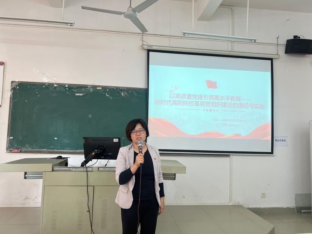 为深入学习贯彻新时代党的建设总要求,筑牢高职院校基层党组织战斗堡垒,推动党建工作与教育教学深度融合,11月12日中午,通识与教育学院教师党支部书记陈少兰以《以高质量党建引领高水平教育——新时代高职院校基层党组织建设的理论与实践》为题,为支部全体党员教师讲授党课。